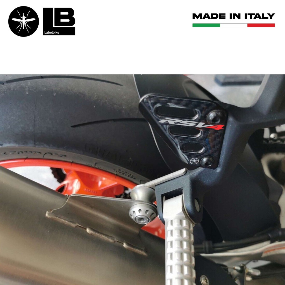 Adesivi battitacco per zona posteriore passeggero realizzati in resina con effetto 3D. Coppia per lato destro e sinistro di protezioni adesive resinate con grafica in Carbon Look (effetto carbonio) e scritta RSV4.
