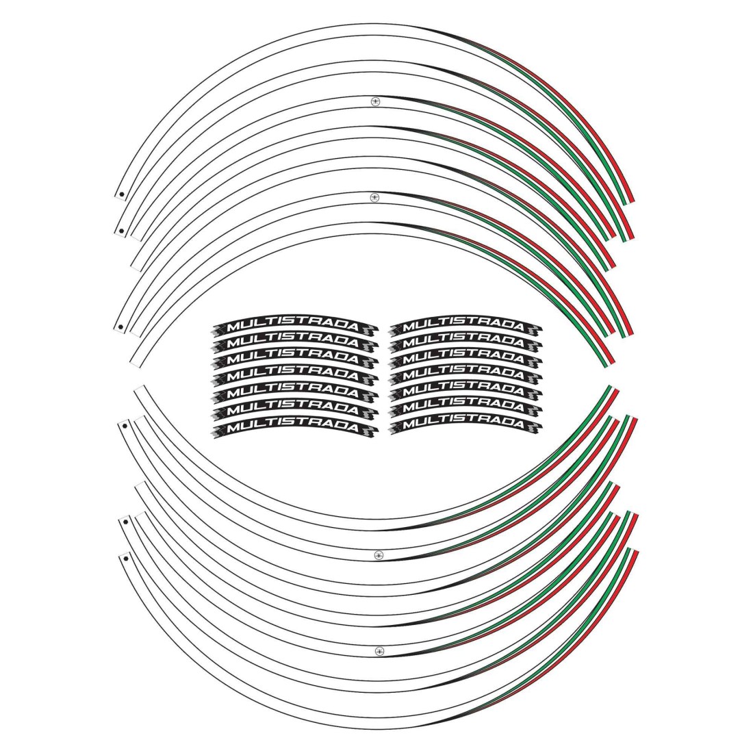 Adesivi per entrambi i cerchi moto, MADE IN ITALY. Grafiche con base in colorazione Bianco, Verde, Nero o Rosso con dettagli bandiera tricolore Italia e scritte Multistrada. Decorano e migliorano l'estetica della tua Ducati, resistono a lavaggi, intemperie ed ai Raggi U.V.