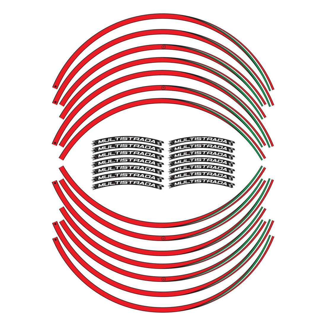 Adesivi per entrambi i cerchi moto, MADE IN ITALY. Grafiche con base in colorazione Bianco, Nero o Rosso con dettagli bandiera tricolore Italia e scritte Multistrada. Decorano e migliorano l'estetica della tua Ducati V4 e V4s, resistono a lavaggi, intemperie ed ai Raggi U.V.