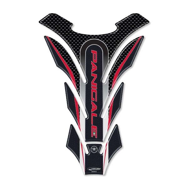 Adesivo Paraserbatoio moto MADE IN ITALY realizzato in resina con effetto 3D. Grafica in Carbon Look (effetto carbonio) con finiture rosse e bianche e scritta PANIGALE rossa.