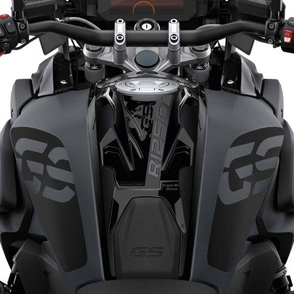 Protezioni adesive 3D per moto compatibili con Bmw R 1250 GS - colorazione Triple Black (2021-2022). Adesivo resinato per proteggere e decorare il serbatoio della tua GS 2023. Grafiche adesive per moto resinate effetto 3D, superficie lucida, per serbatoio moto in colorazione Triple Black.