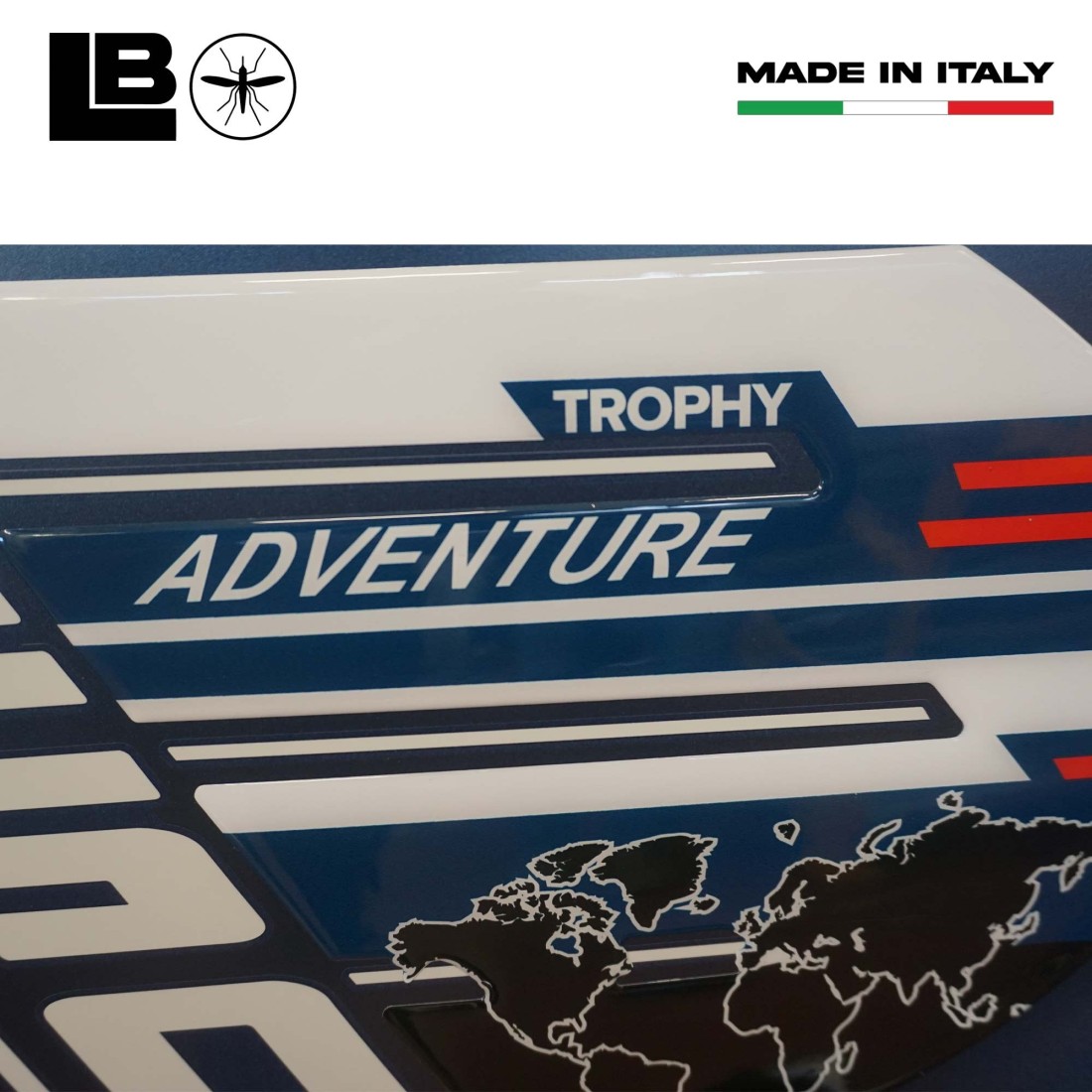 Protezioni adesive resinate per serbatoio moto BMW R 1250 GS Adventure Trophy 2022 - 2024. Adesivi in resina gel 3D Esclusivi - Labelbike®. Coppia di adesivi, lato destro e sinistro, proteggi serbatoio. Adesivi MADE IN ITALY realizzati in resina con effetto 3D. Grafica ispirata alla colorazioni Trophy della moto.