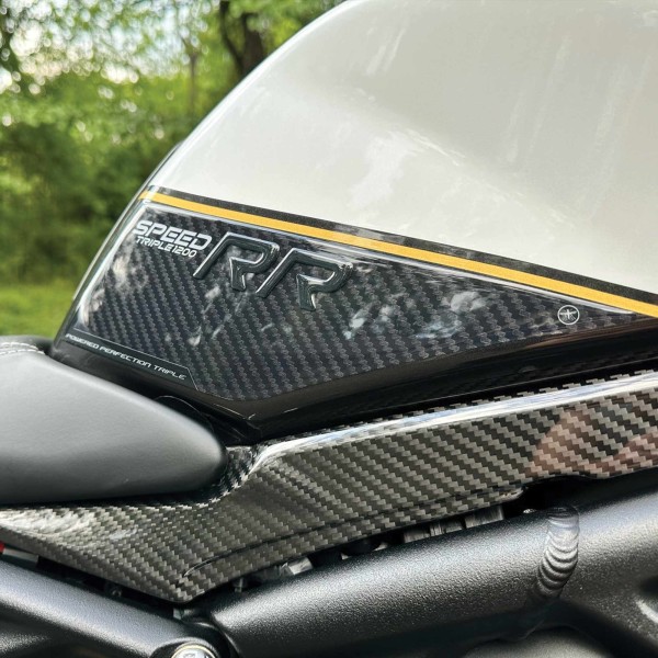 Protezioni adesive resinate per serbatoio moto Triumph Speed Triple 1200 RR. Coppia di adesivi in resina gel 3D Esclusivi - Labelbike®. Adesivi proteggi serbatoio moto ideali per Triumph Speed Triple 1200 RR 2022.