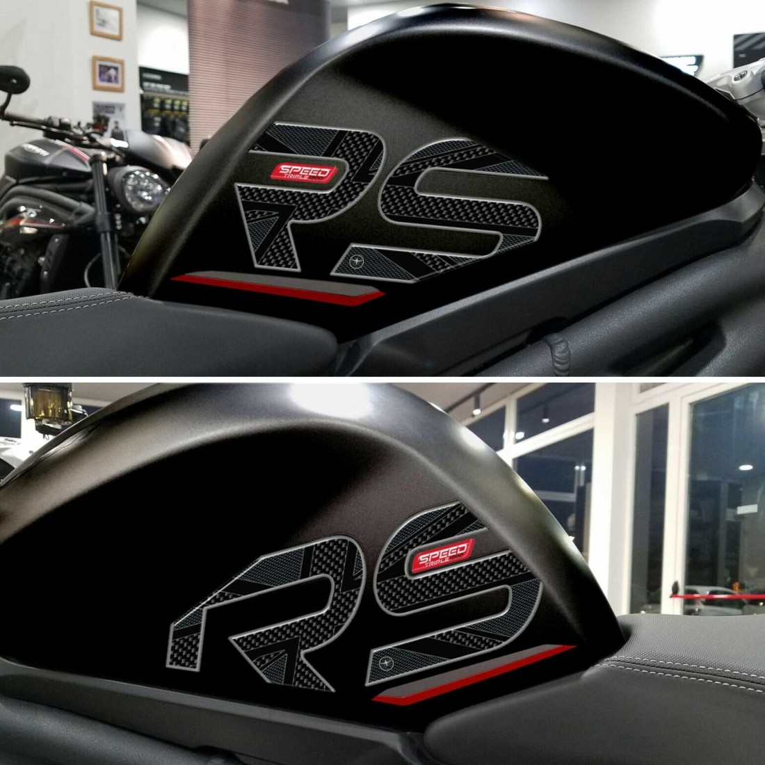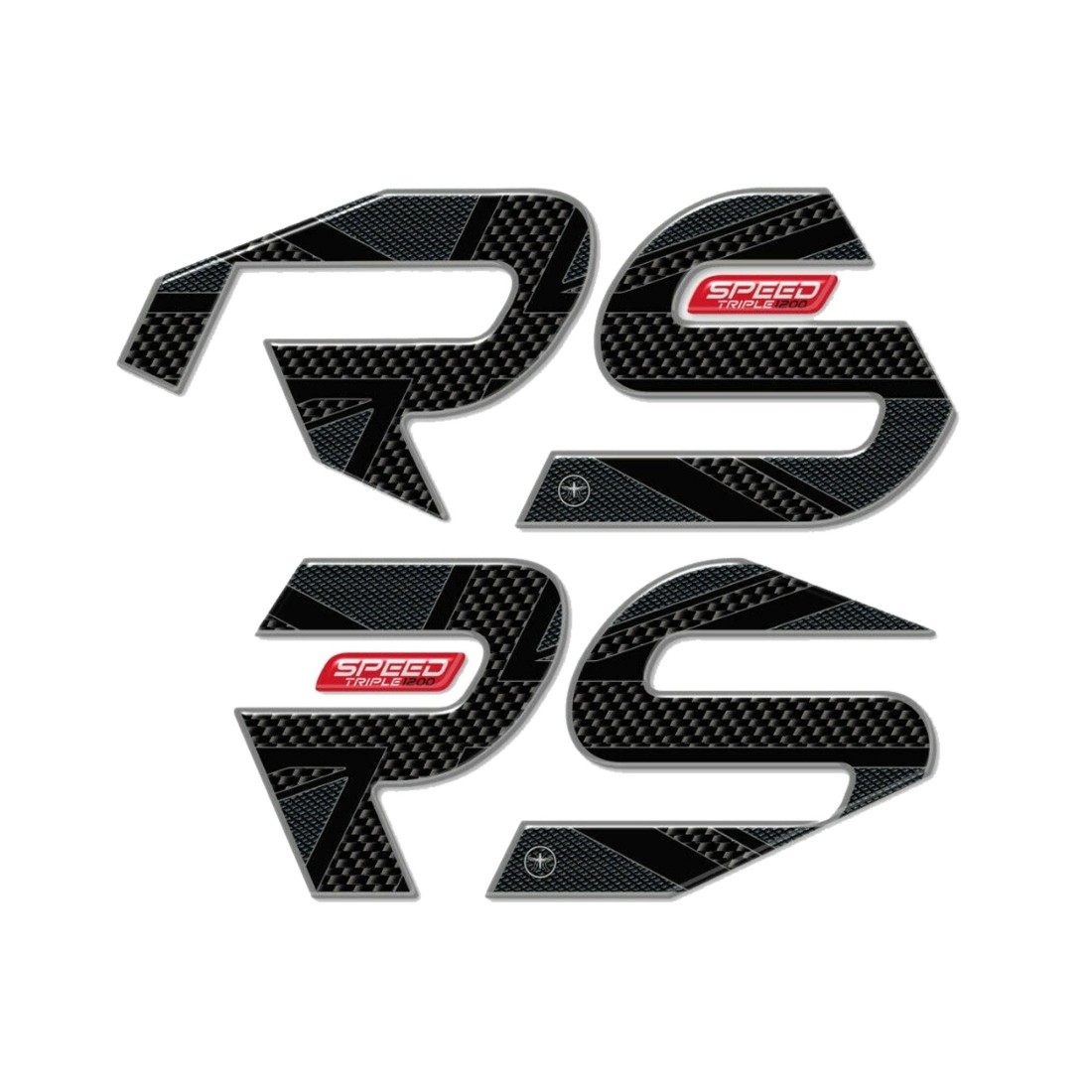 Protezioni adesive resinate laterali per serbatoio moto Triumph Speed Triple 1200 RS (2021 - 24). Due adesivi in resina gel 3D Esclusivi - Labelbike. Adesivi protezione per serbatoio MADE IN ITALY realizzati in resina con effetto 3D. Grafica con base Nera, Simil Carbonio e Simil Antiscivolo con finiture ROSSE o GIALLE e scritta Speed Triple 1200 RS 2021 - 2024. Riparano da Urti e Graffi il serbatoio della tua moto, resistono alle intemperie ed ai Raggi U.V.
