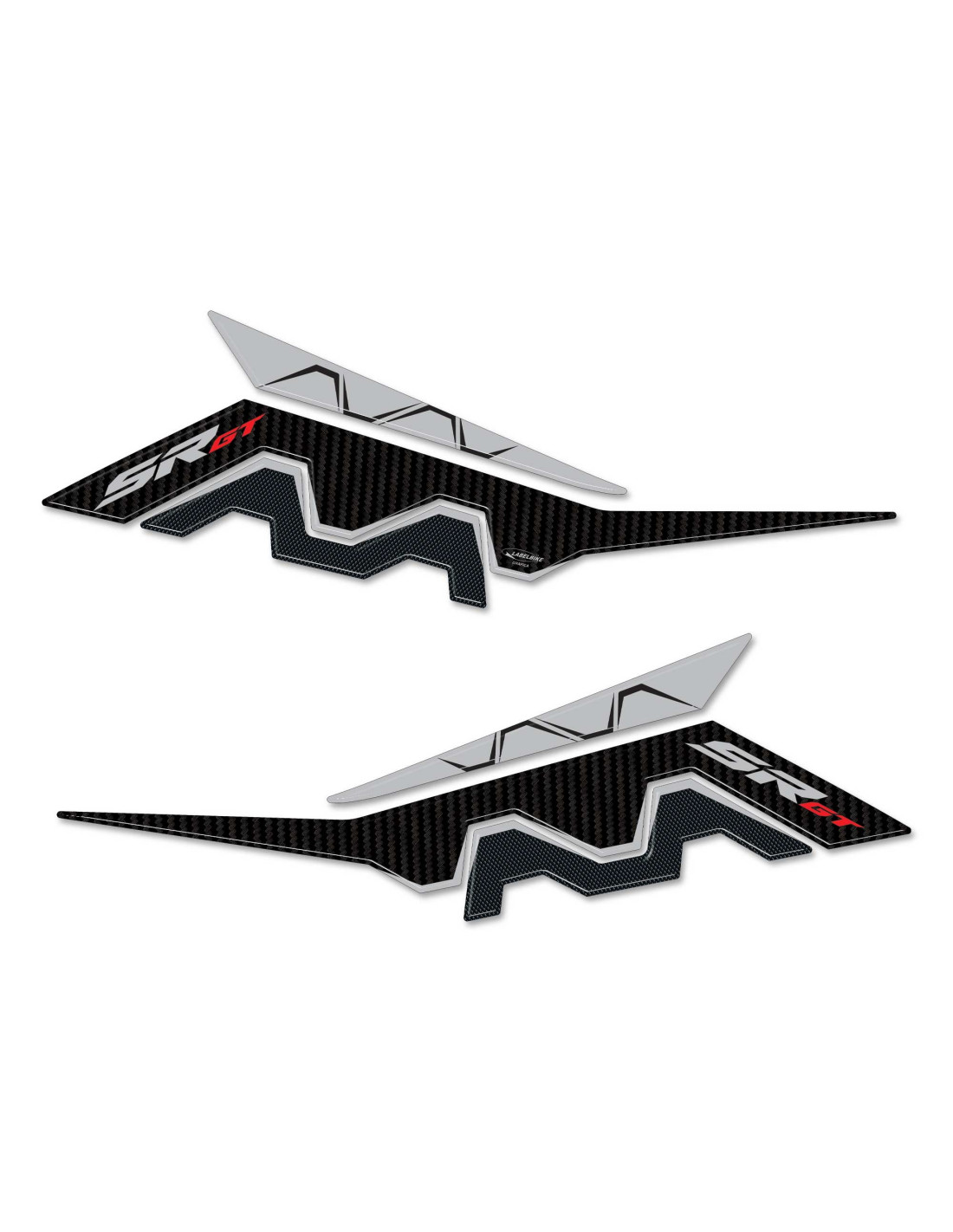 Protezioni resinate adesive per zona pedane laterale scooter Aprilia SR GT. Grafica con base in Simil Antiscivolo e Carbonio, grigio e scritta SR GT. Adesivi resinati effetto 3D, Esclusivi Labelbike® MADE IN ITALY.