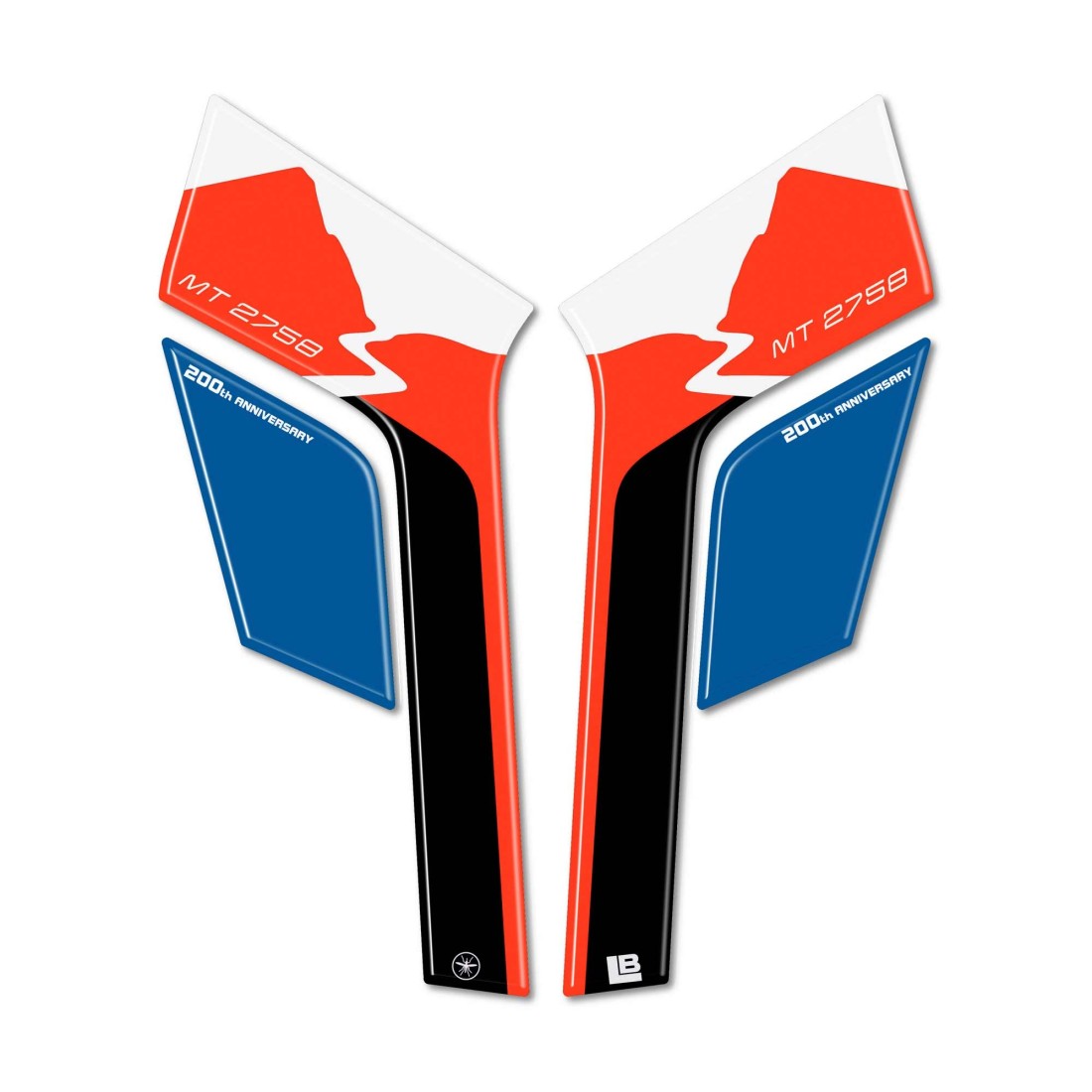 Adesivi in resina gel 3D, Esclusivi Labelbike® MADE IN ITALY. Realizzati per decorare e proteggere la zona dei parasteli del parafango anteriore della tua moto. Adesivi compatibili con Moto Guzzi Stelvio Duecento Tributo dal 2025.