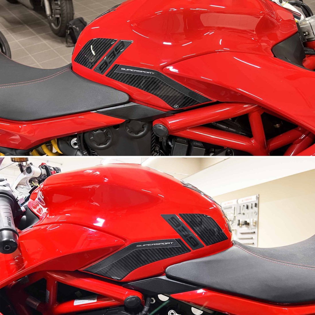 Dimensione: per Serbatoio Ducati Supersport 939 2017-2020. Adesivi resinati protezioni serbatoio moto con grafica effetto Simil Carbonio con Scritta Supersport 939 come da foto. Realizzato in resina con effetto 3D. Ripara da Urti e Graffi il serbatoio della tua moto e resiste alle intemperie, lavaggi ed ai Raggi U.V.