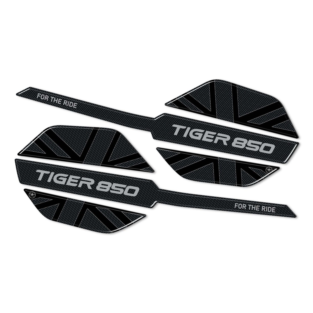 Protezioni adesive resinate per paramani Triumph Tiger 850 Sport 2021-2025. Due adesivi in resina gel 3D Esclusivi - Labelbike®. Adesivi 3D lato destro e sinistro per Tiger 850 2021 - 2025, MADE IN ITALY, realizzati in resina con effetto 3D. Grafica con base Nero e Carbon Look (effetto carbonio) e scritta in grigio For the Ride, Tiger 850.