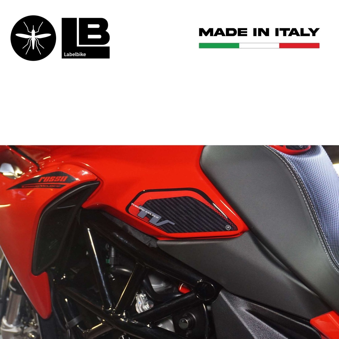Protezioni adesive resinate laterali per serbatoio moto MV Agusta Turismo Veloce 800. Due adesivi in resina gel 3D Esclusivi - Labelbike. Adesivi protezione per serbatoio MADE IN ITALY realizzati in resina con effetto 3D. Grafica in Simil Carbonio e rosso con scritta Turismo Veloce. Riparano da Urti e Graffi il serbatoio della tua moto, resistono alle intemperie ed ai Raggi U.V.