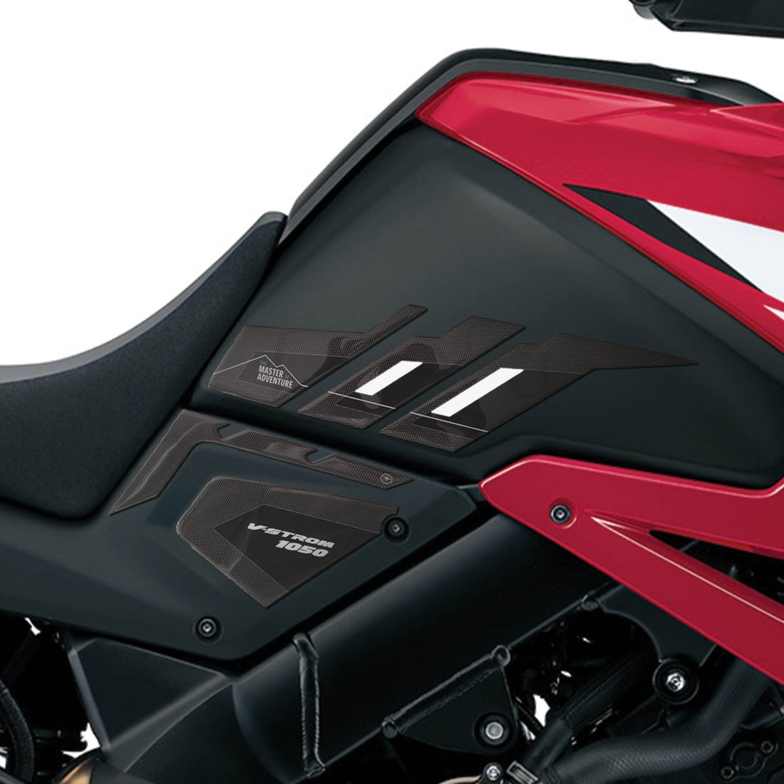 Adesivi Protezione laterali serbatoio realizzati in resina per Moto Suzuki V-Strom 1050. Grafica con base Nera e Simil Antiscivolo con finiture in Grigio e Rosso o Bianco