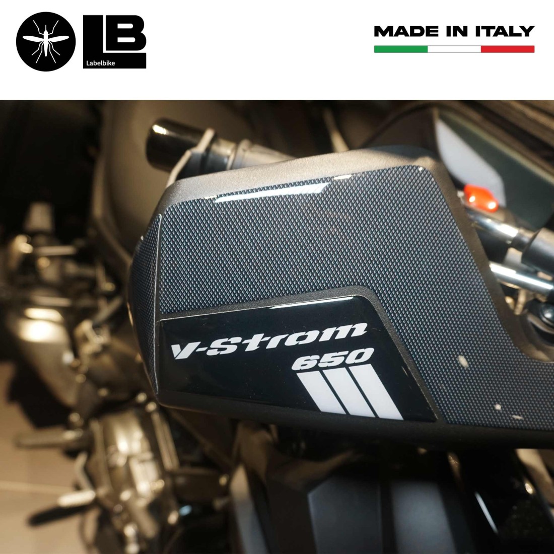 Adesivi Made in Italy, Esclusivi Labelbike, realizzati in resina con carbon look (effetto carbonio), e scritta "V-Strom 650". I nostri adesivi decorano e rendono unica la tua Suzuki, riparano da Urti e Graffi e resistono alle Intemperie ed ai Raggi U.V.