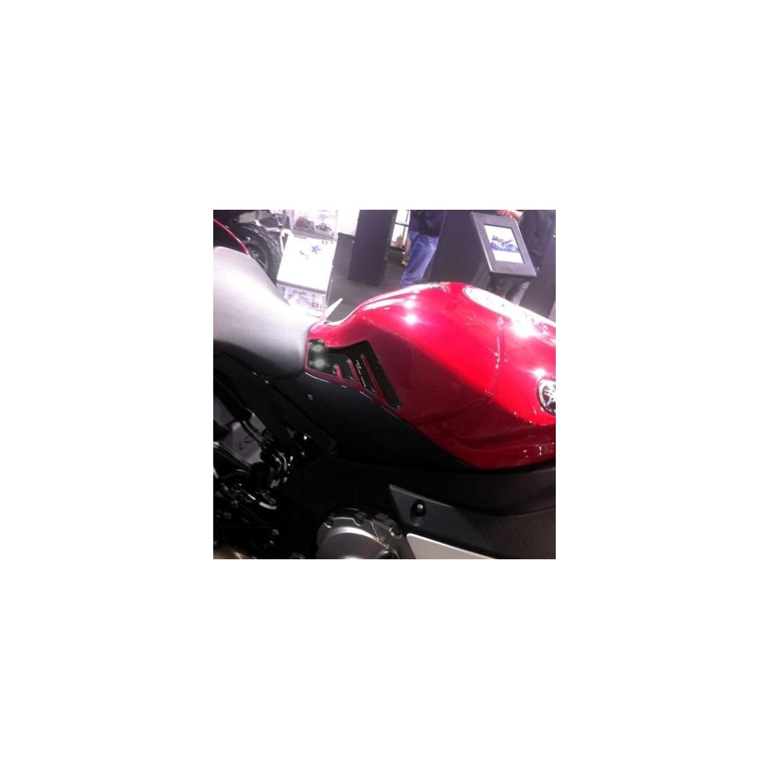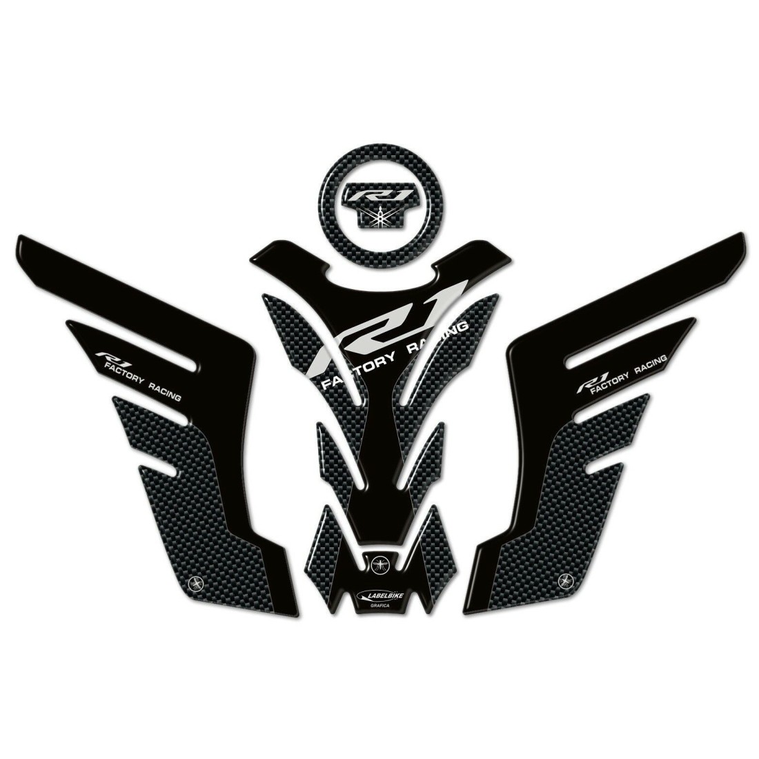 Kit di protezioni adesive per serbatoio YZF - R1 dal 2015 al 2024. Questo set di adesivi in resina, ha grafica in nero e in simil carbonio con scritte grigie e bianche.