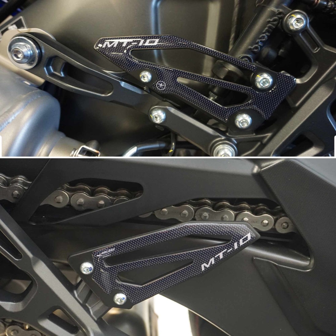 Adesivi battitacco realizzati in resina con effetto 3D. Coppia per lato destro e sinistro di protezioni adesive resinate con grafica in Carbon Look (effetto carbonio) e scritta MT-10.