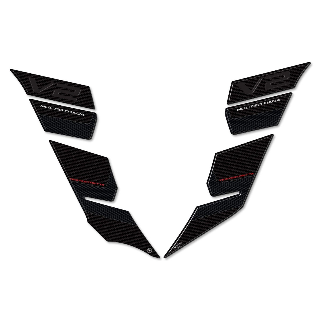 Adesivi moto MADE IN ITALY realizzati in resina con effetto 3D. Grafica in Carbon Look (effetto carbonio) con scritte V2 Multistrada Testastretta.