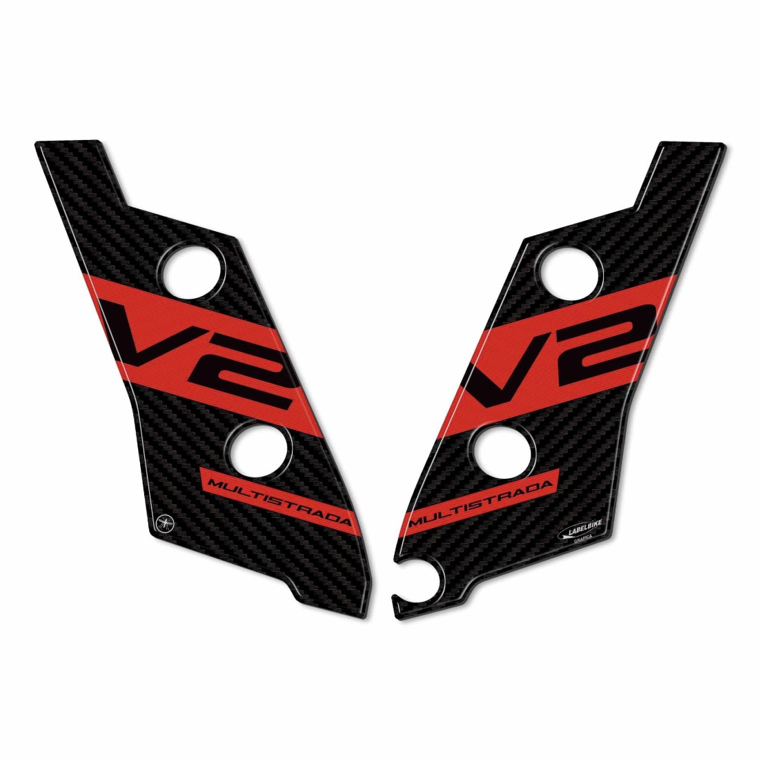 Protezioni adesive resinate laterali per parafango moto Ducati Multistrada V2 dal 2021-23. Due adesivi in resina gel 3D Esclusivi - Labelbike. Adesivi laterali per parafango moto MADE IN ITALY realizzati in resina con effetto 3D. Grafica in Carbon Look (effetto carbonio) e scritte Multistrada V2. Decorano e Riparano da Urti e Graffi i para-steli del parafango della tua Multistrada V2 2021-2023, resistono a lavaggi, intemperie ed ai Raggi U.V.