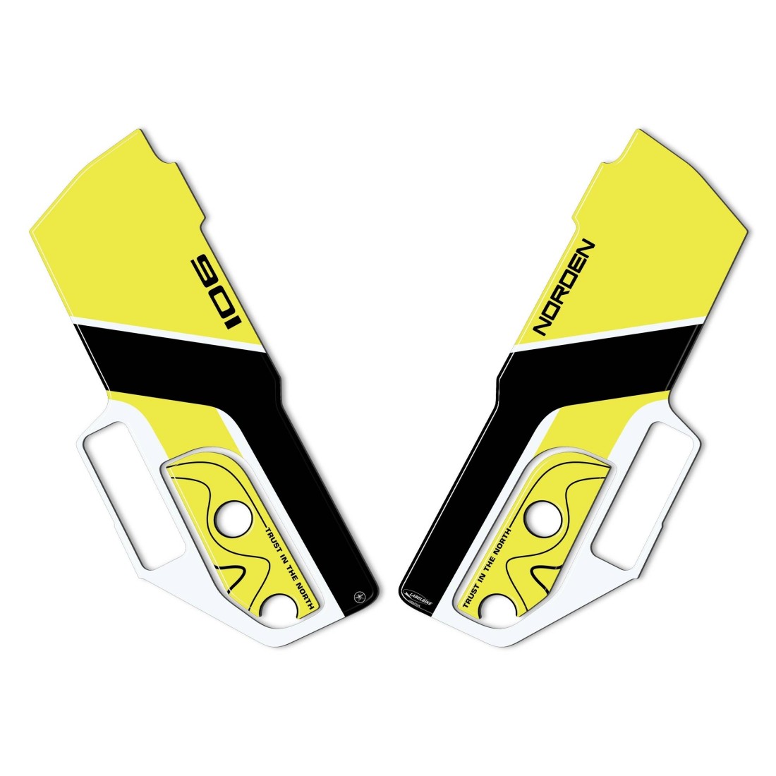 Protezioni adesive resinate laterali per parafango moto Husqvarna Norden 901 2022. Due adesivi in resina gel 3D Esclusivi - Labelbike. Adesivi laterali protezioni per parafango anteriore MADE IN ITALY realizzati in resina con effetto 3D. Grafica in giallo, bianco, nero con scritta TRUST IN THE NORTH-NORDEN-901. Decorano e Riparano da Urti e Graffi i para-steli del parafango della tua Norden 901 2022, resistono a lavaggi, intemperie ed ai Raggi U.V.