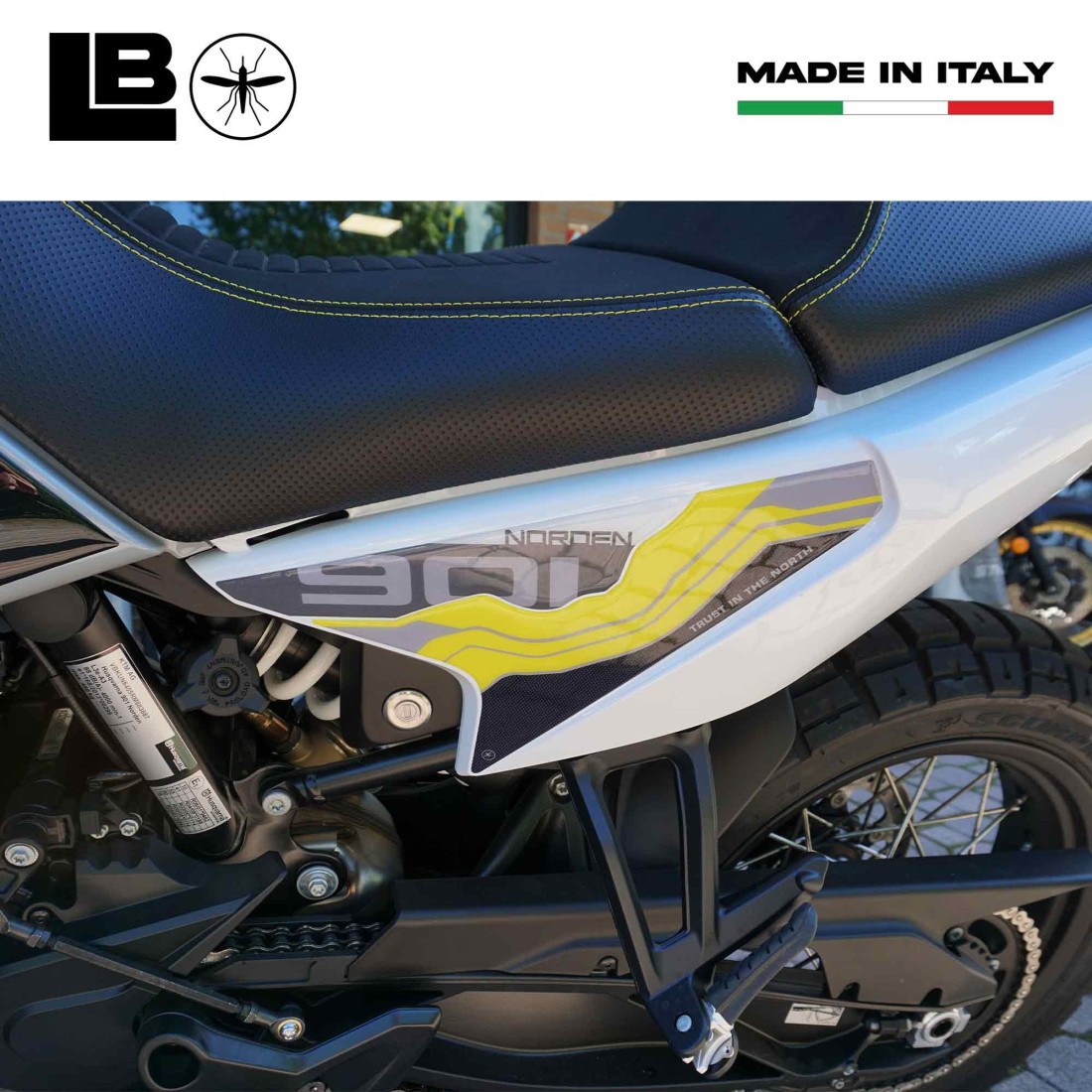 Protezioni fianchetti coda laterali posteriori 3D compatibili con moto Husqvarna Norden 901 2024. Kit di adesivi resinati per proteggere e decorare la zona sottosella coda moto della tua Norden 2024. Protezioni adesive realizzate in resina con effetto 3D e scritta NORDEN 901.