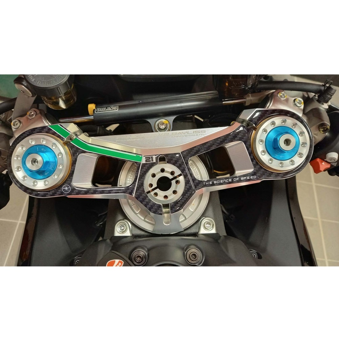 Protezione adesiva resinata per Piastra Forcella Sterzo moto Ducati Panigale. Adesivo in resina gel 3D Esclusivo - Labelbike®. Adesivo proteggi Piastra Sterzo ideale per V2 Bayliss 2022-2024.