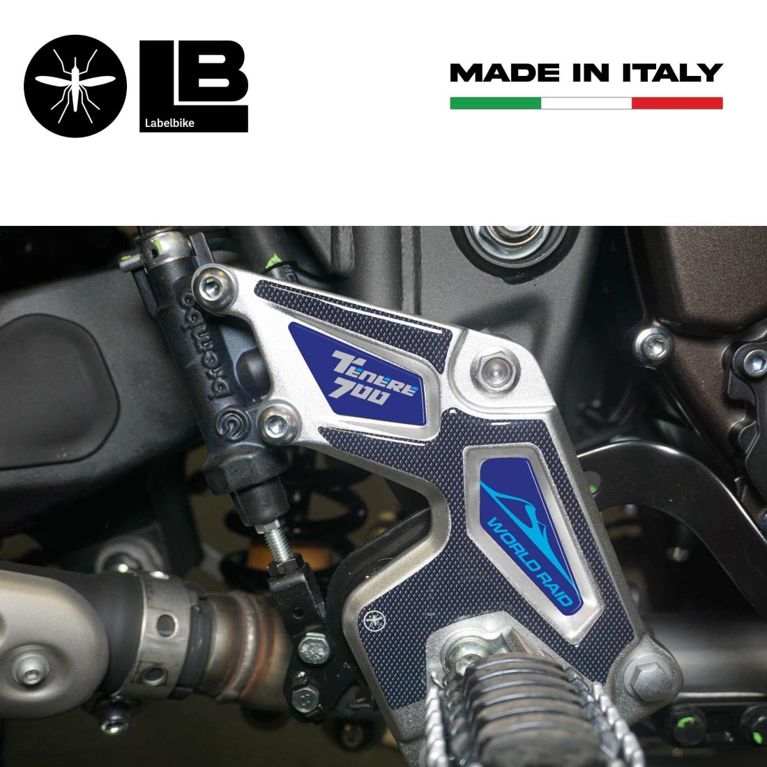 Set di adesivi con base nera e Simil Antiscivolo con finiture Grigio o Azzurre per colorazioni 2022. Realizzati in resina 3D compatibili con battitacco moto Yamaha Tenere 2022.