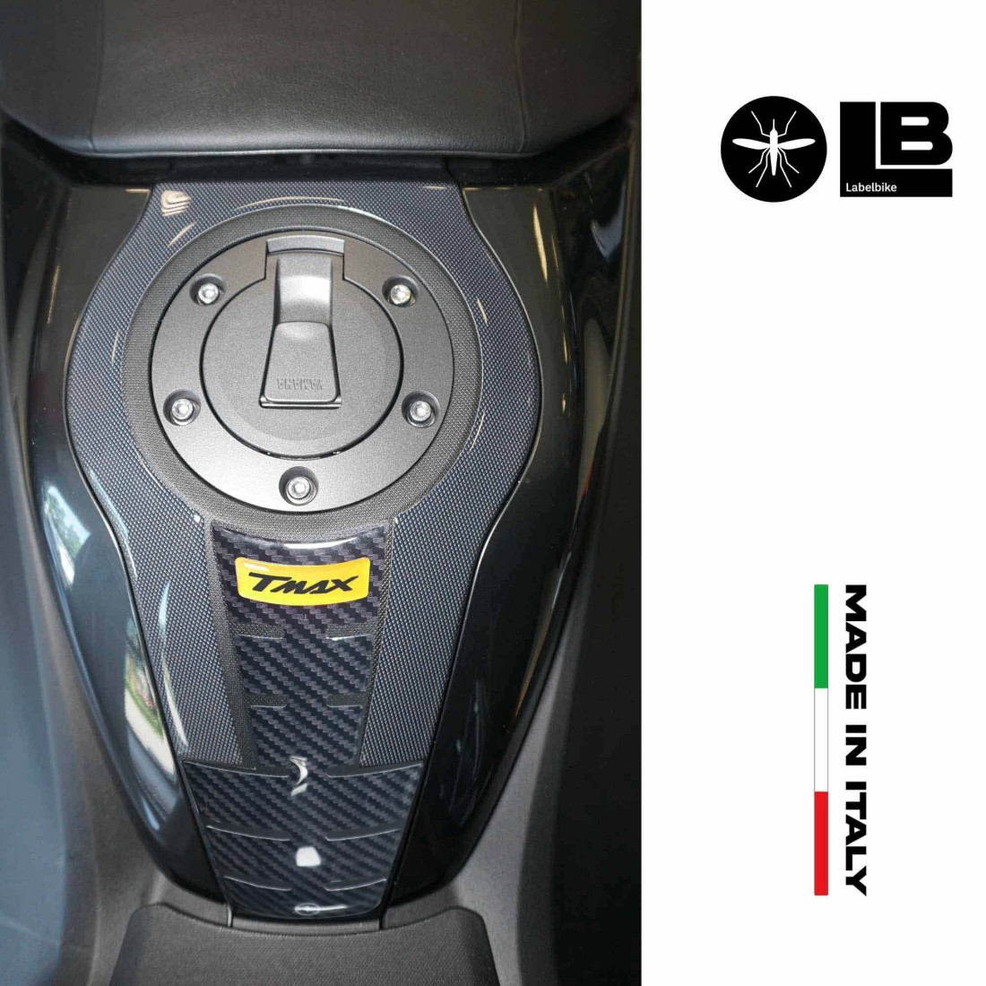 Protezione Adesiva per zona centrale Tunnel Tmax 2022 - 2025 e versione Tech Max. Grafica con base in Simil Antiscivolo ed effetto carbonio con scritta Tmax in 6 colorazioni differenti. Adesivi resinati effetto 3D, Esclusivi Labelbike MADE IN ITALY.