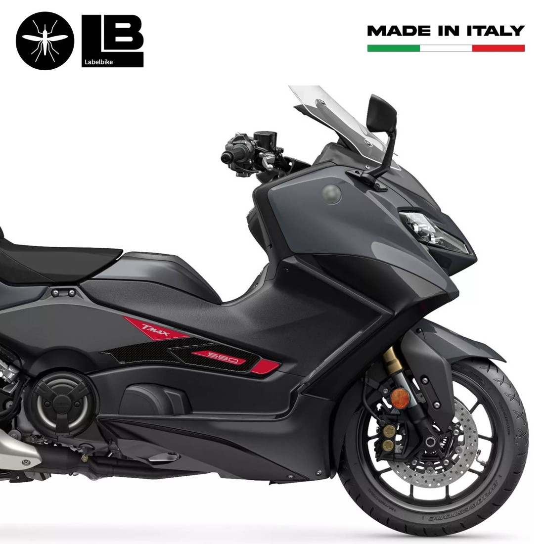 Coppia per lato destro e lato sinistro zona sottosella scooter. Protezione Adesiva per boomerang laterale Tmax 2022 - 2025 e versione Tech Max. Grafica con base in Simil Carbonio con finiture Giallo, Nero, Oro Metallizzato, Argento, Rosso Ergal o Blu Metallizzato e scritte Tmax 560 (6 colorazioni differenti). Adesivi resinati effetto 3D, Esclusivi Labelbike MADE IN ITALY.