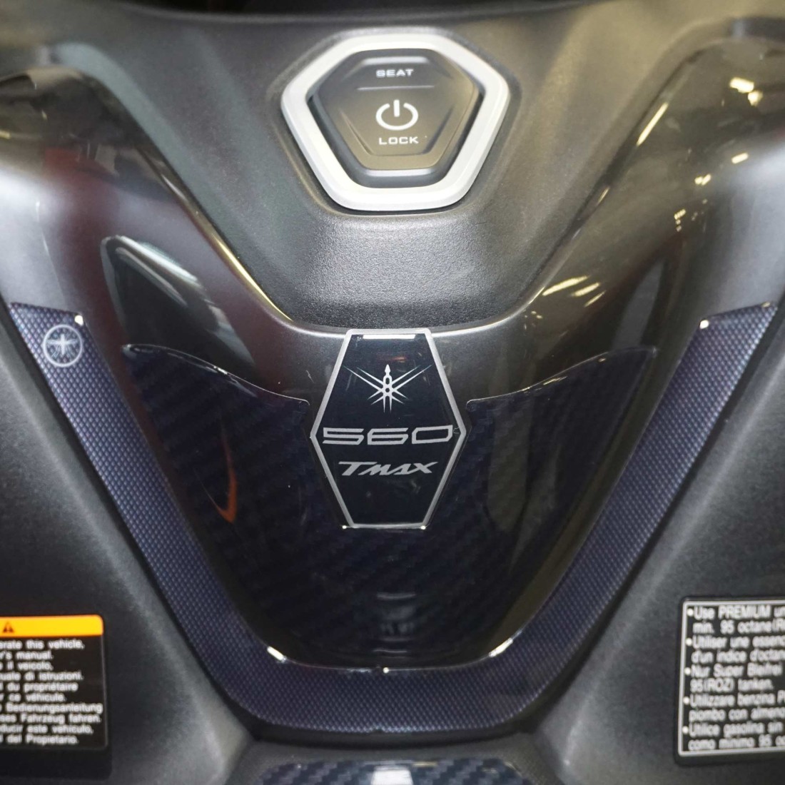 Protezioni Adesive per la zona sotto il pulsante di accensione Tmax 2022 - 2025 e versione Tech Max. Grafica con base in effetto carbonio ed antiscivolo. Adesivi resinati effetto 3D, Esclusivi Labelbike MADE IN ITALY.