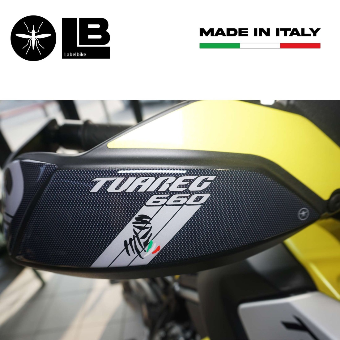 Protezioni adesive resinate per Paramani moto Aprilia Tuareg 660 2022-25. Due adesivi per paramani moto lato destro e sinistro in resina gel 3D Esclusivi - Labelbike®. Adesivi per paramani moto MADE IN ITALY realizzati in resina con effetto 3D. Grafiche universali, adesivi 3D con base in effetto antiscivolo e scritte TUAREG.