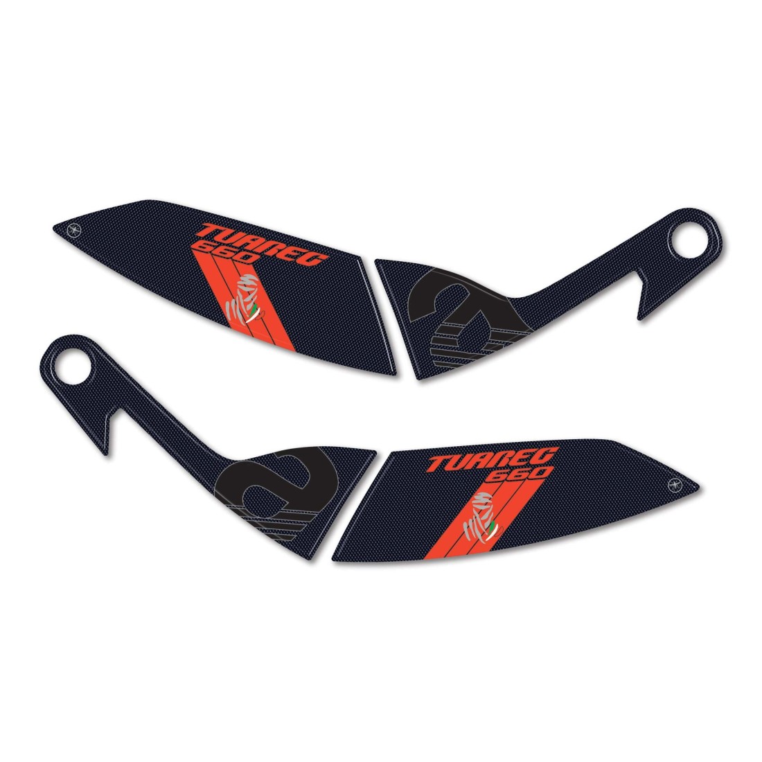 Protezioni adesive resinate per Paramani moto Aprilia Tuareg 660 2023-25. Due adesivi per paramani moto lato destro e sinistro in resina gel 3D Esclusivi - Labelbike®. Adesivi per paramani moto MADE IN ITALY realizzati in resina con effetto 3D. Grafiche per colorazioni Atreides Black e Canyon Sand 2024.