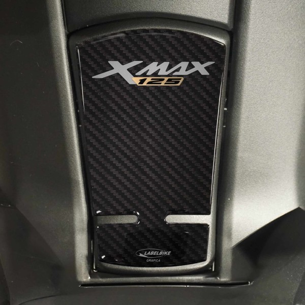 Protezione Adesiva per zona centrale sportello serbatoio. Grafica con base in Simil Carbonio con scritta Grigia Xmax e varianti colore in blu, nero o oro per la scritta 125. Adesivi resinati effetto 3D, Esclusivi Labelbike® MADE IN ITALY.