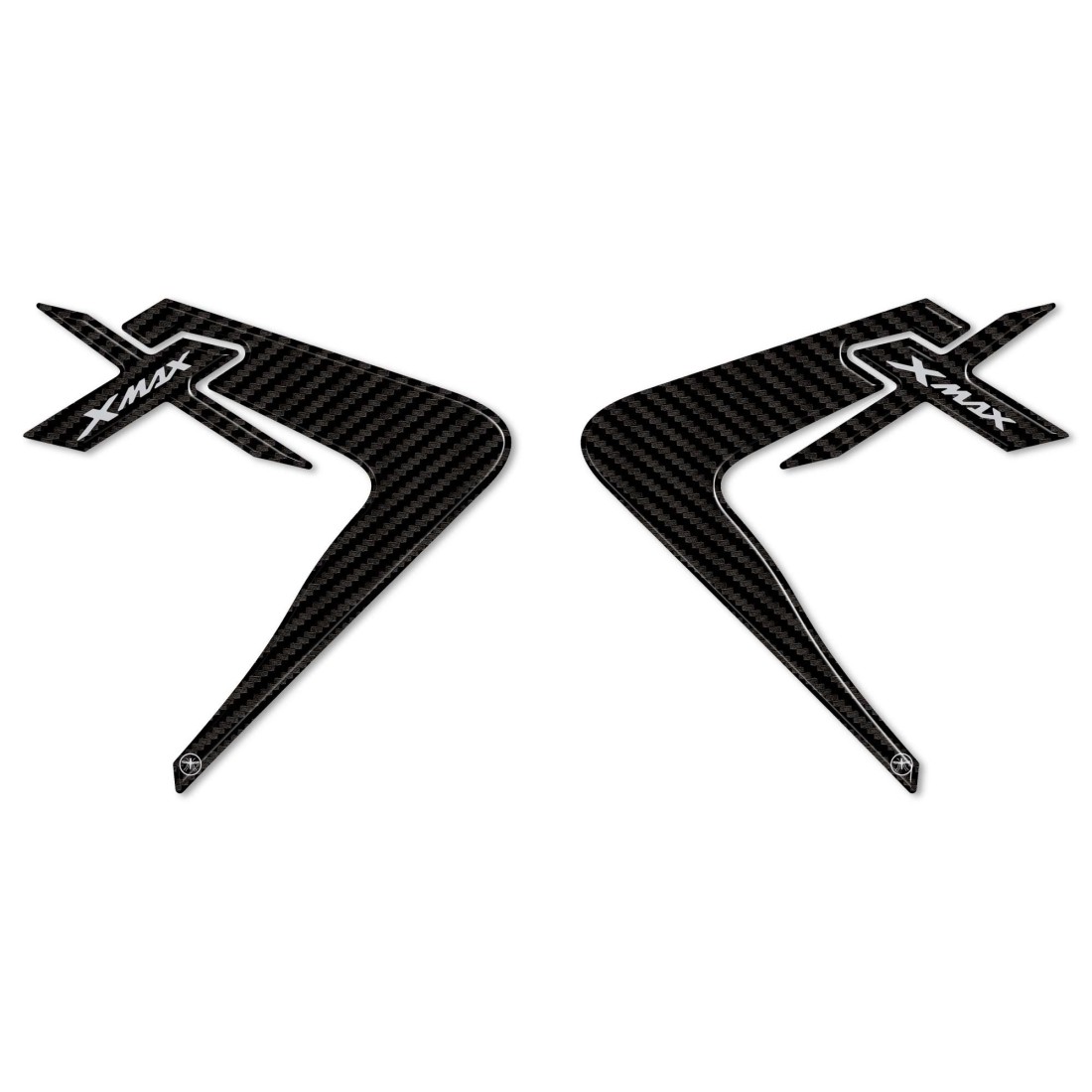Protezioni adesive 3D compatibili con Scooter Yamaha X-max 125 - 300 dal 2023. Adesivi resinati per proteggere e decorare le carene del tuo X max 125-300 2023-2024. Protezioni adesive con effetto 3D, superficie lucida, per lato destro e sinistro scooter, realizzate in resina con base Carbon Look (simil carbonio) e scritta Xmax in grigio.