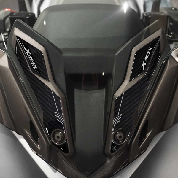Protezioni adesive 3D compatibili con Scooter Yamaha X Max 125 e 300 2023 - 2024. Adesivo resinato per proteggere e decorare il cupolino del tuo Xmax 125-300. Protezione adesiva con effetto 3D, superficie lucida, per supporto cupolino parabrezza 2023-2024 Xmax 125 e 300, realizzata in resina con base Carbon Look (simil carbonio) e varianti colore in blu, nero e oro per la scritta Xmax.