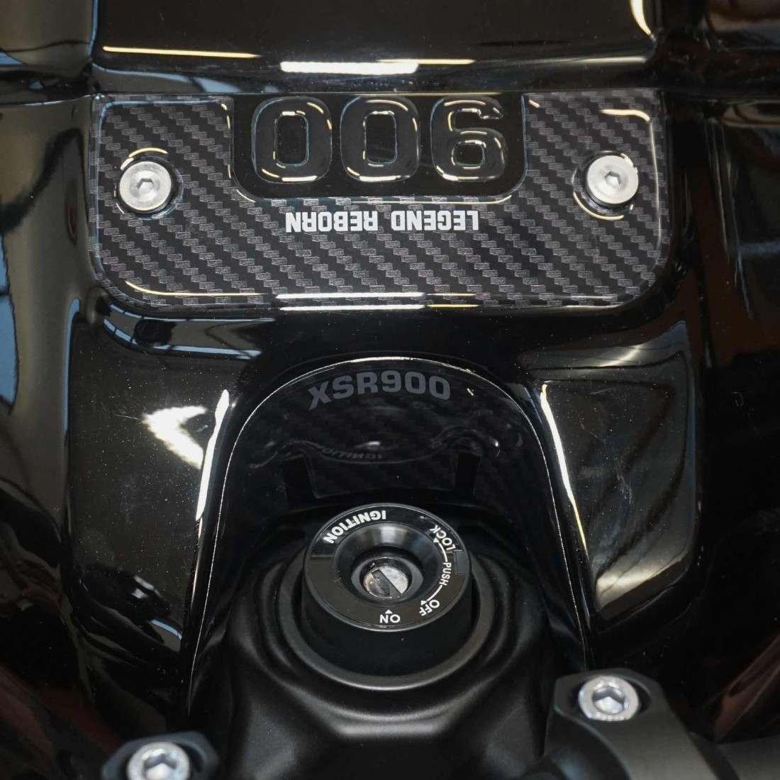 Protezione adesiva 3D compatibile con zona accensione Yamaha XSR900 2022-2023. Adesivo resinato per proteggere e decorare la tua XSR900. Adesivo per XSR 900 effetto 3D, superficie lucida, per zona chiave accensione dal 2022 al 2023, realizzati in resina con base effetto carbonio e scritta XSR900 Legend Reborn.