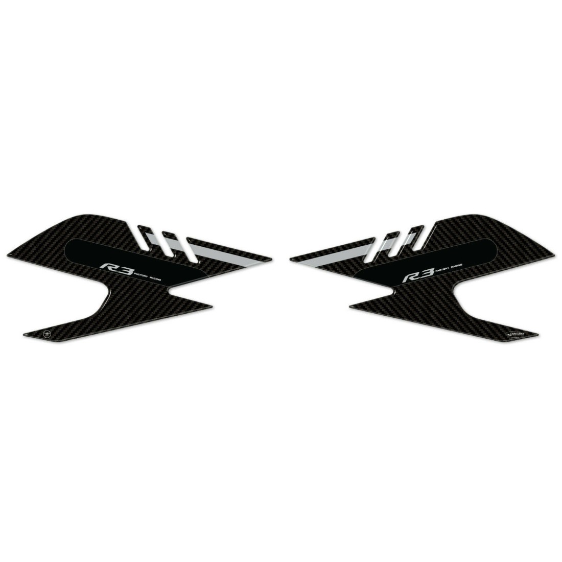 Due Adesivi serbatoio resinati per moto Yamaha R3 2019-2023. Adesivi 3D con grafica in Simil Carbonio e finiture Grigie e Nere, su misura per modello R3 dal 2019.